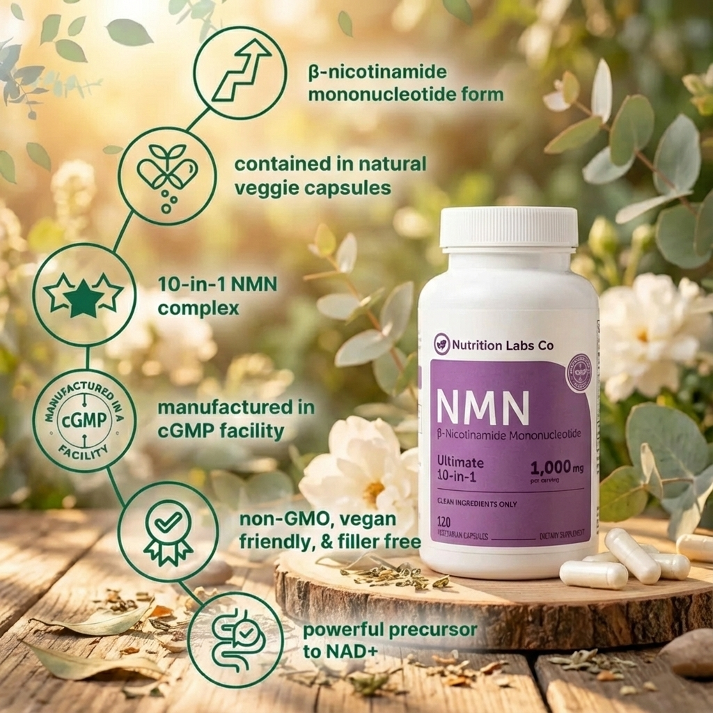 NMN combined with glutathione, CoQ10, and other nutrients supports cell repair and overall resilience.