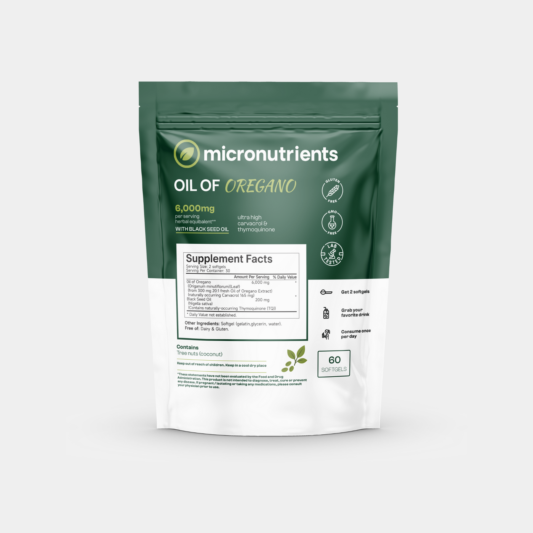 Each serving delivers 6,000mg of Oil of Oregano (20:1 extract) with 165mg of naturally occurring carvacrol, plus 200mg of Black Seed Oil for enhanced benefits.
